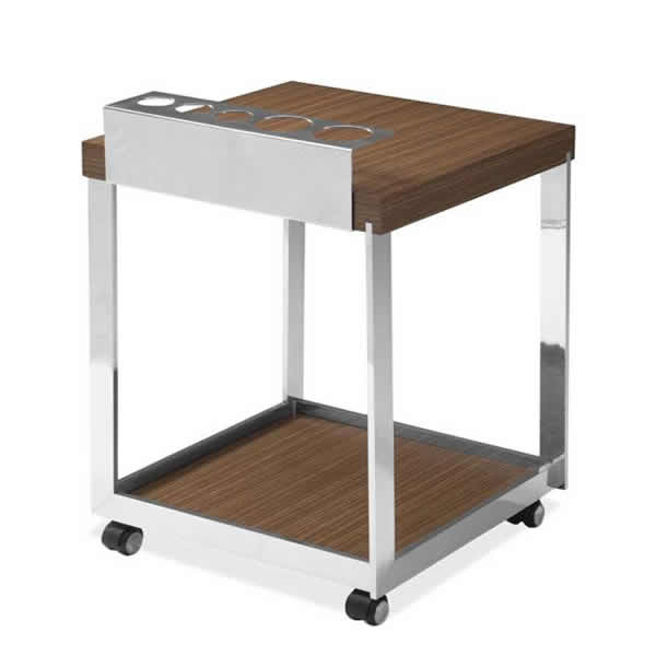Esse carrinho de bebidas é fabricado com estrutura em alumínio e tampo laminado de madeira na cor tabaco, agregando qualidade e resistência ao produto e elegância ao ambiente.